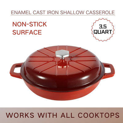 La fonte est également chauffée et a l'excellente conservation de la chaleur. Vous pouvez employer la cocotte en terre peu profonde de fonte pour le poulet rôti de faire sauter à feu vif, à cuisson lente, ragoût de cari, grillant des biftecks ou faisant des gâteaux cuire au four. Sur la table, conservant les nourritures chaudes pendant le long temps. Et c'est un stockage froid idéal de nourriture. La cocotte en terre peu profonde de fonte travaille sur toutes les gammes à cuire telles que le gaz, le cooktop électrique, le dessus en céramique, de fourneau et l'induction. Facile à nettoyer, la rouille de preuve, émail n'exige aucun assaisonnement, réduit au minimum le collage, et résiste souiller, ébrécher et fendre. Les couleurs du revêtement émaillé sont variées, sembleront belles dans votre cuisine. Service adapté aux besoins du client : Couleur/forme/logo/bouton de bibliothèque/de forme/d'emballage de poignée. Ce style pour la cocotte en terre peu profonde de fonte est très populaire sur le marché, et il est vendu dans Amazone et centres commerciaux importants autour du monde.